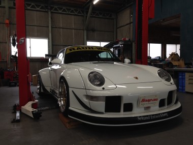 またしても更新不足(^^;; ポルシェ993RWB!! タペットカバーからのオイル漏れでお預かりしました☆ 毎度のことですが、リフトに入れるの緊張します(>_